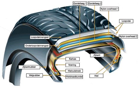 Tread = loopvlak: 1 laag rayon (karkas) + 2 lagen staal (gordel) + 1 laag nylon (stabilisatiegordel) Sidewall = zijwand/wang: 1 laag rayon