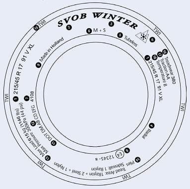 De band is aan deze code te identificeren (producent, plaats, bandafmeting en bandconstructie)