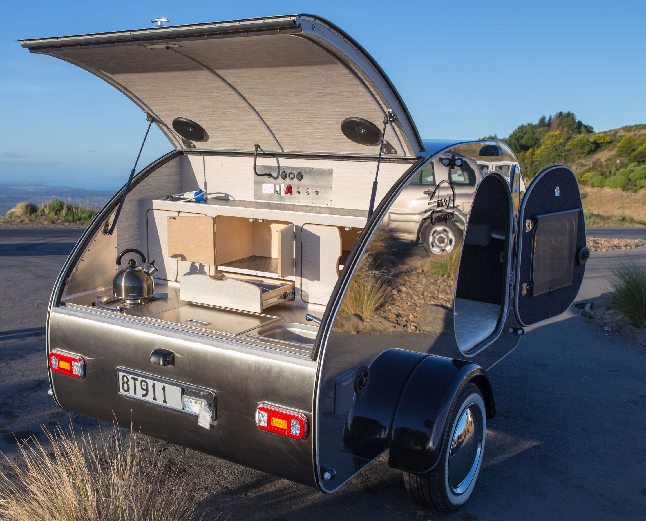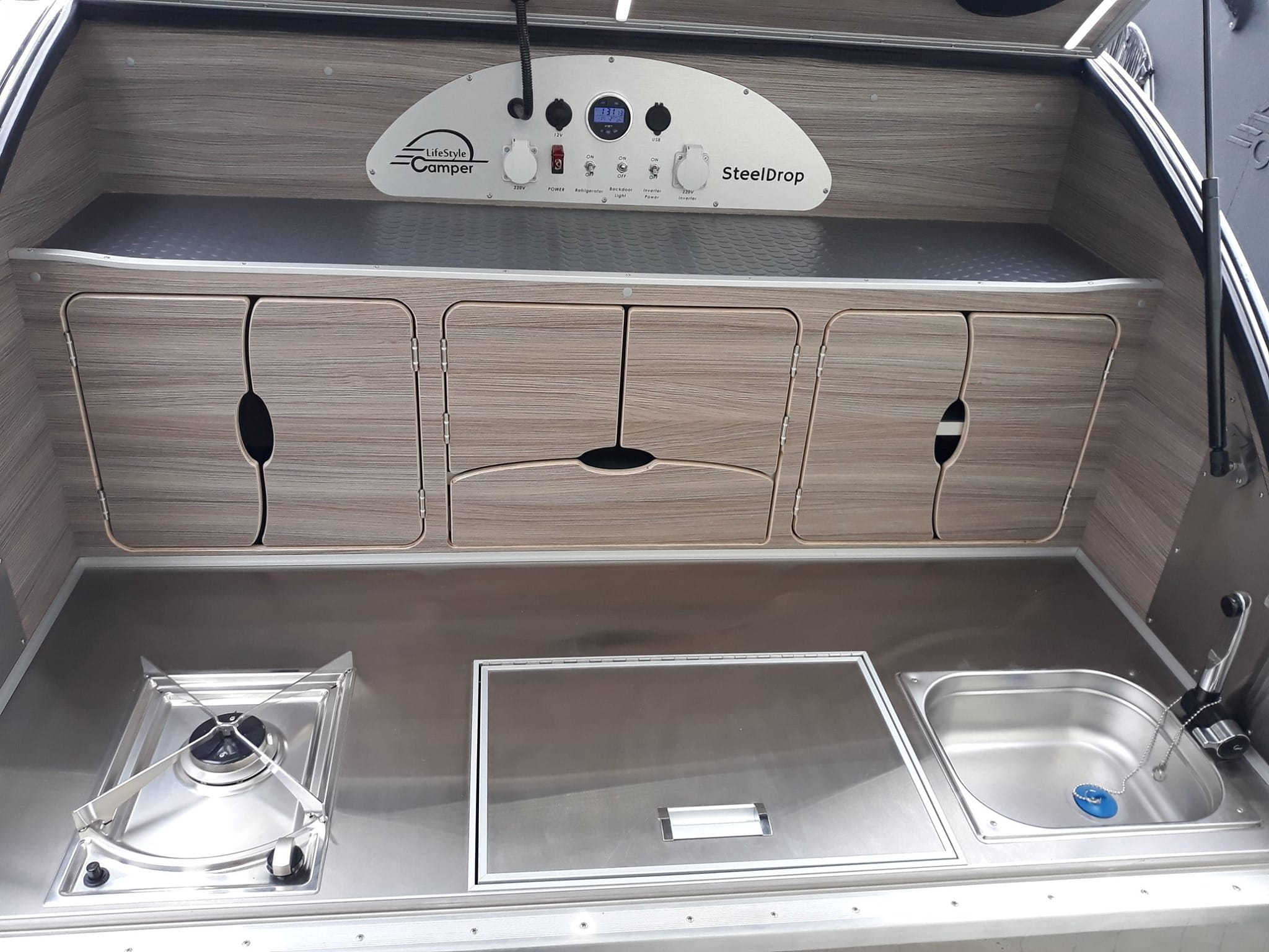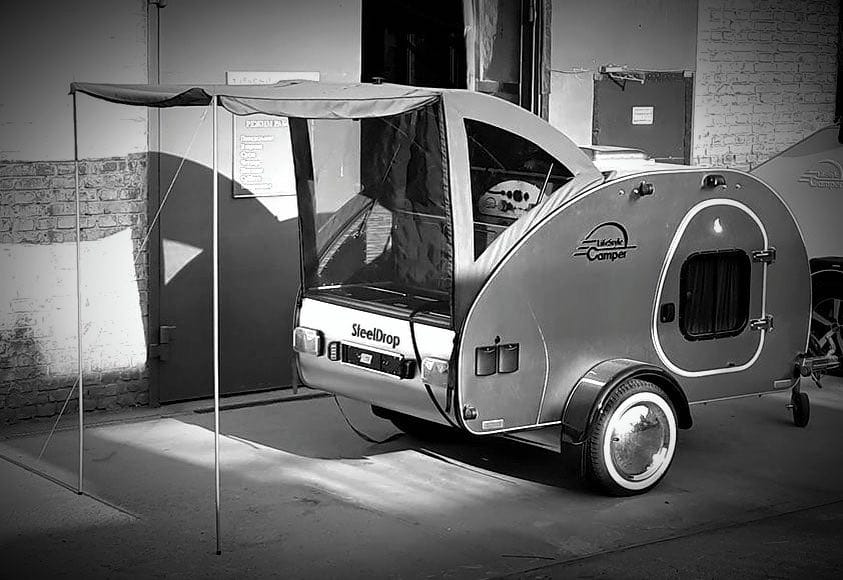 Dé camper trailer om mee te nemen naar uw droombestemming. Dit teardrop model staat voor hightech in een retrolook jasje. Bent u een natuurliefhebber, strandgast, citytourer, roadtripper of…. dit model is geschikt voor elk gewenst avontuur. Of u nu alleen reist of met uw gezin, deze camper trailer biedt vele mogelijkheden. Het is een compacte trailer maar van alle gemakken voorzien. De Steeldrop kenmerkt zich zoor de geïsoleerde geborstelde rvs buitenwand. Door deze rvs buitenwand lijkt de camper trailer op te gaan in de omgeving. Met een gewicht van slechts 470 kg kan deze camper trailer door vrijwel elke auto getrokken worden.
