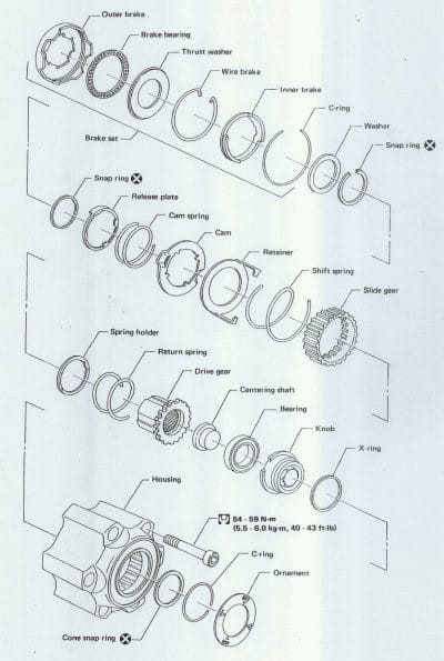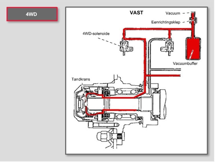 4WD: Als de aandrijflijn in ‘4WD’ wordt gezet, zal de 4WD-solenoide(magnetische spoel) aangestuurd worden en vacuüm doorlaten naar de voorzijde van de tandkrans. Deze zal op zijn beurt een inschakelende beweging maken.
