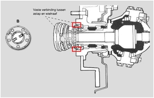 Situatie A: De wielnaaf staat in stand FREE los van de vrijloopnaaf, het hart van de vrijloopnaaf wordt aangedreven door de astap. De wielnaaf wordt in deze stand dus niet aangedreven.