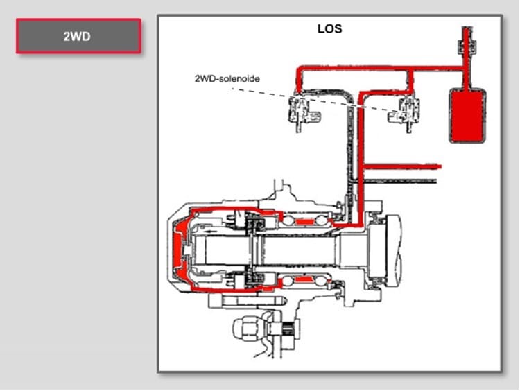 2WD: Als de aandrijflijn in ‘2WD’ wordt gezet zal de 2WD-solenoide aangestuurd worden en vacuüm doorlaten naar de achterzijde van de tandkrans. Deze zal op zijn beurt een uitschakelende beweging maken.